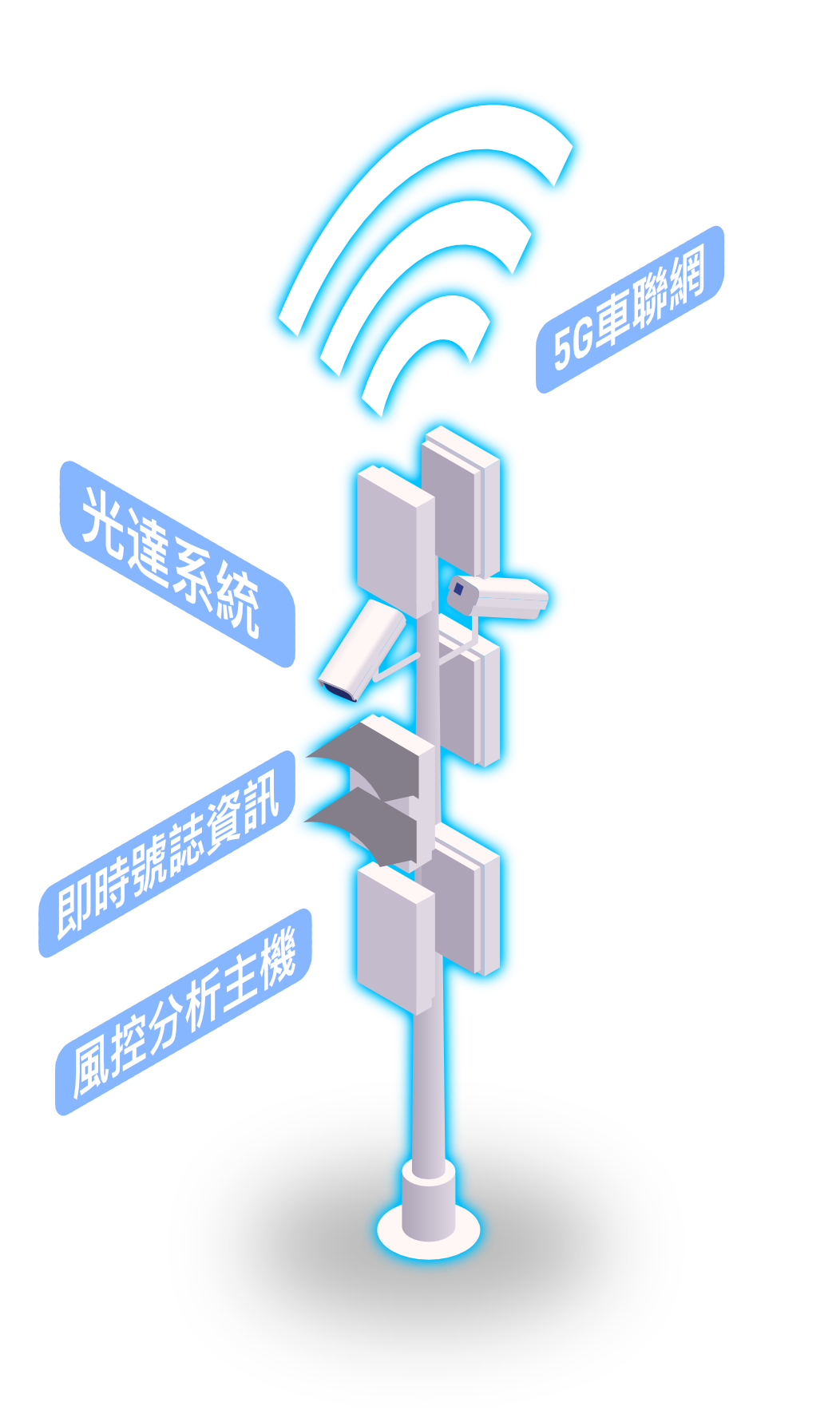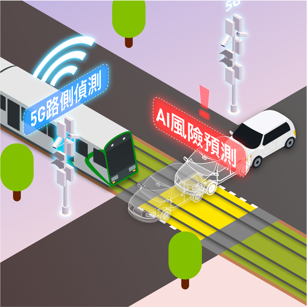 以5G車聯網技術建構輕軌路口安全智慧輔助系統,結合光學感測技術與AI預測路口闖入風險事件,將風險與燈號秒數推送給駕駛,輔助辨識風險掌握行車狀況。